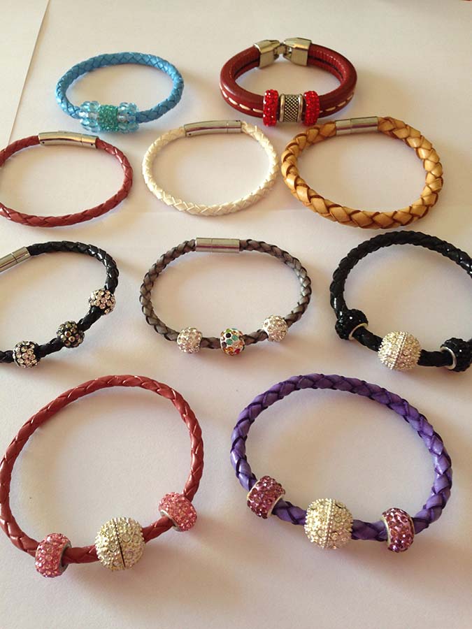 Pulsera de cuero trenzado con abalorio de cristal incrustado y cierre de imán con cristales incrustados o cierre de clip. Tenemos disponibles en rebajas los siguientes modelos: