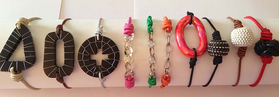 Pulsera elástica elaborada con diversos abalorios de cerámica, cuero, madera o plata, según modelo. Estos son los modelos que tenemos rebajados: